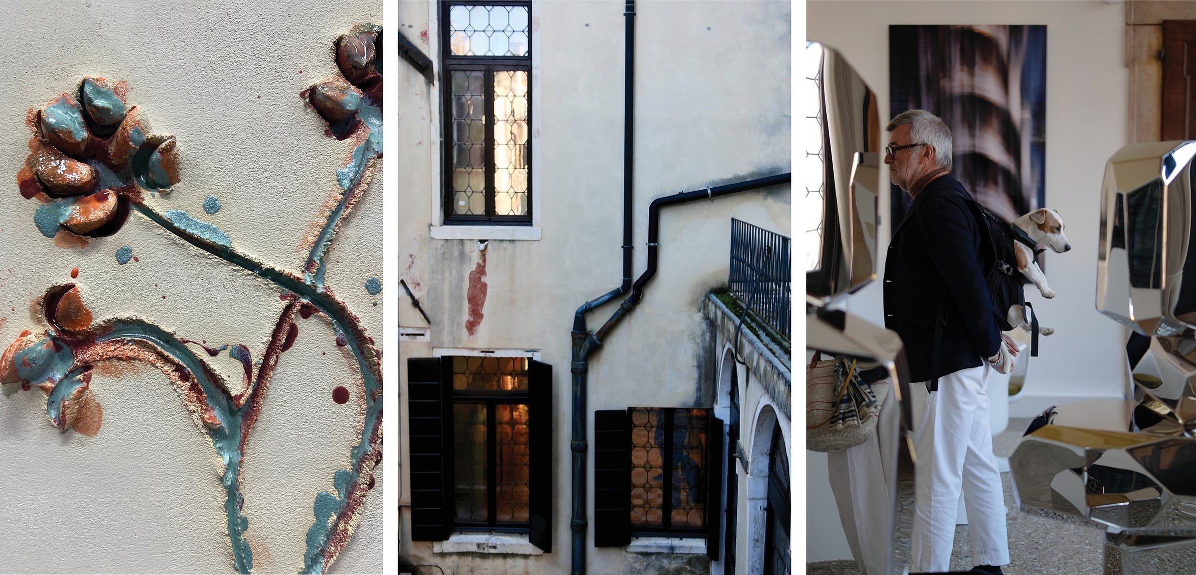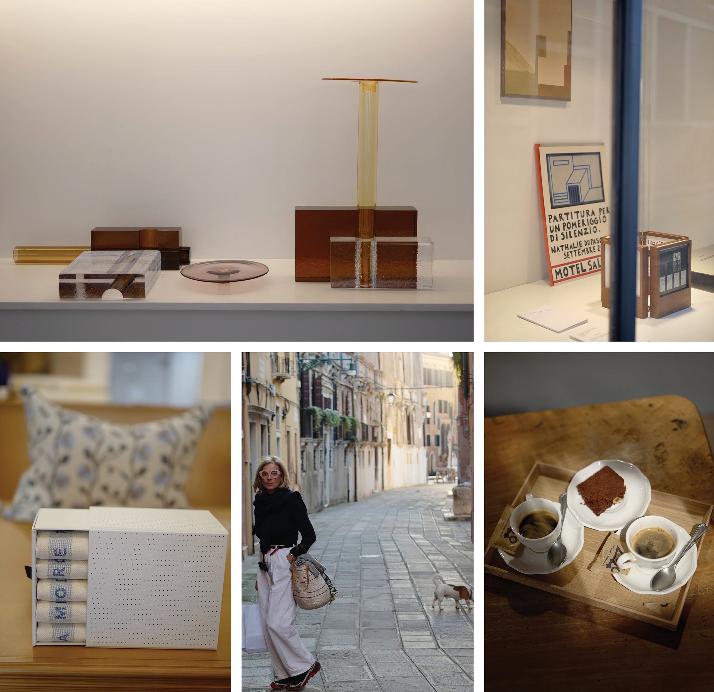 But persistence pays. Giorgio Mastinu’s gallery is tiny, splendid, and the kind of place you only find once you stop expecting Venice to perform for you. Its opening hours are as eccentric as his curation. He was showing Inchiostri by Ronan Bouroullec, created with the Murano maestro Simone Cenedese—constructivist vases where weight confronts airiness and color tests transparency. His gallery is in the San Marco that tourists miss: the hidden maze of Casa Yali’s glass, the textiles of Chiarastella Cattana, and the frames of Ottica Manuela. In these alleys, Venice sheds its skin as a museum and becomes a village again. With greetings, not just looks.